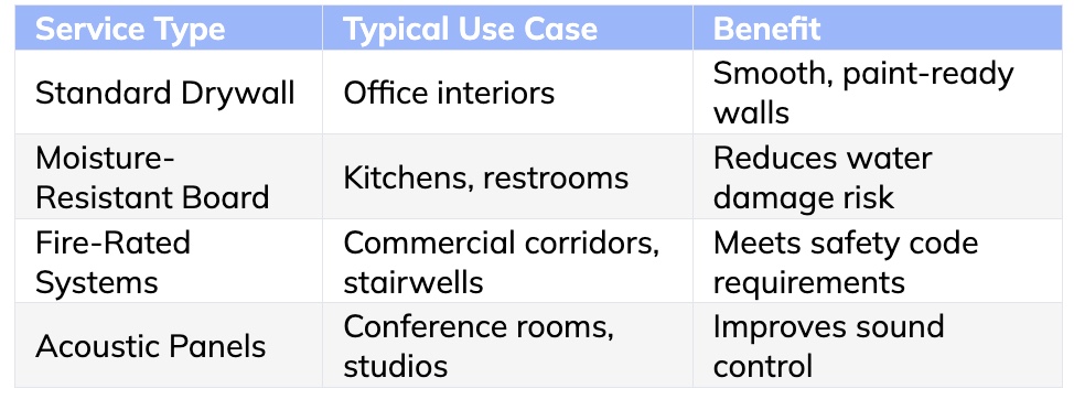 We use drywall types suited to each room, such as moisture-resistant boards for bathrooms and sound-dampening panels for bedrooms or offices. This helps improve durability and comfort in the home.